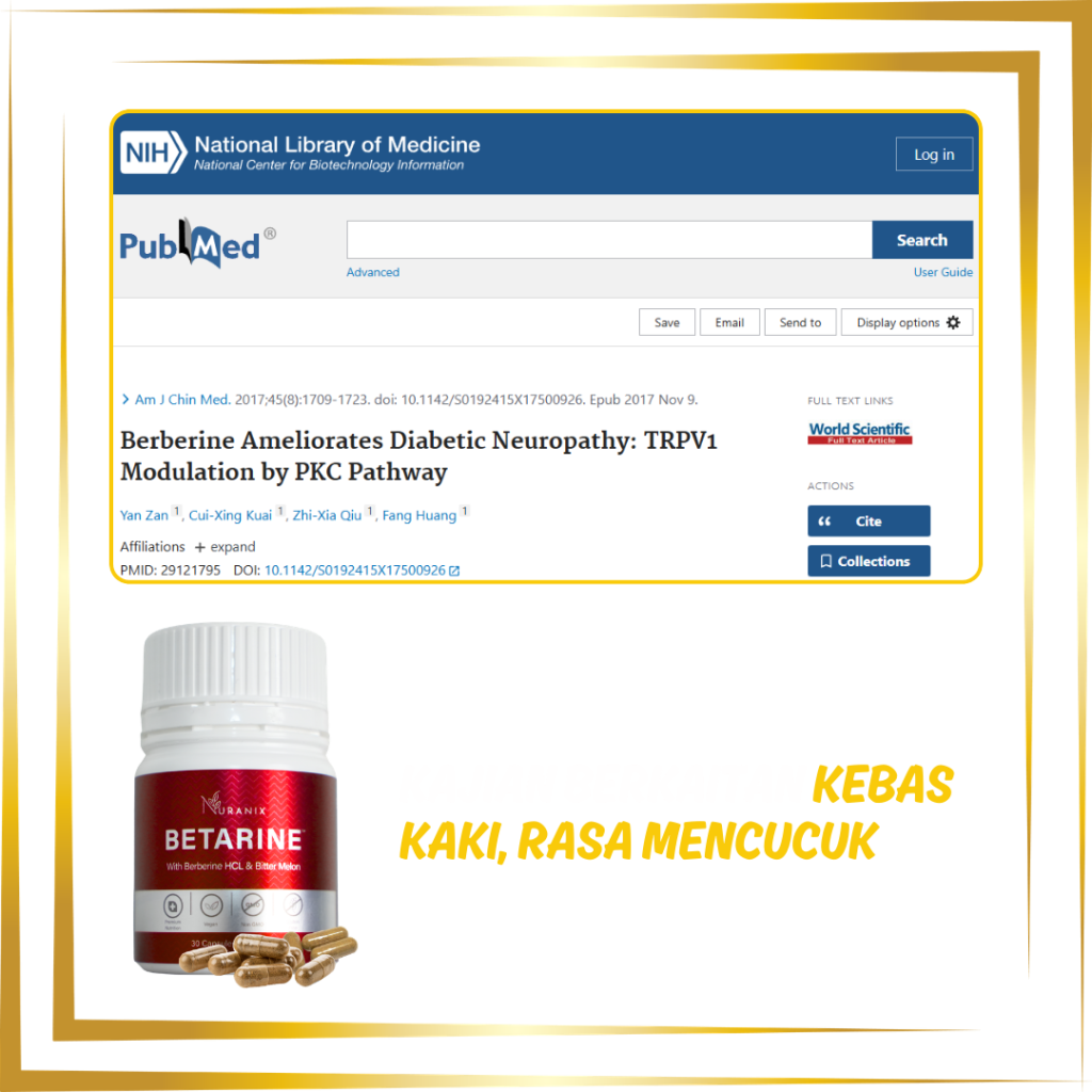 Neuropati diabetes berlaku apabila paras gula yang tinggi merosakkan saraf periferi, menyebabkan simptom seperti kebas kaki, rasa mencucuk dan sensasi terbakar pada tapak kaki. Kajian menunjukkan bahawa berberine membantu mengurangkan tekanan oksidatif dan keradangan pada saraf, sekaligus membantu melindungi fungsi saraf periferi dalam keadaan diabetes. Kesan perlindungan saraf ini menunjukkan bahawa berberine berpotensi membantu menyokong kesihatan saraf pada pesakit diabetes.