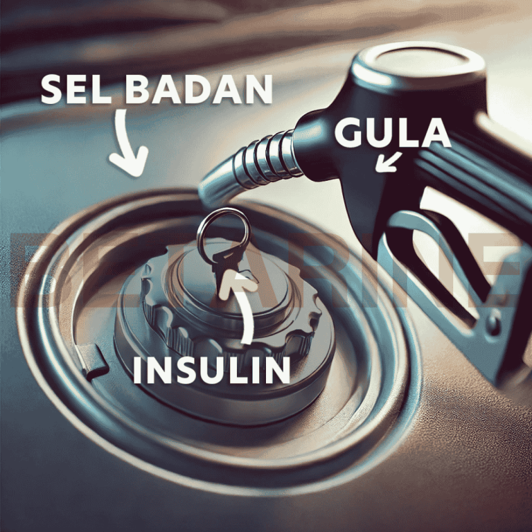 Bayangkan badan kita ni macam kereta, dan insulin ni macam ‘kunci’ untuk buka tangki minyak kereta (sell dalam badan) untuk kita isi petrol (gula) ke dalamnya dan gunakan petrol tadi sebagai sumber tenaga untuk menggerakkan kereta.